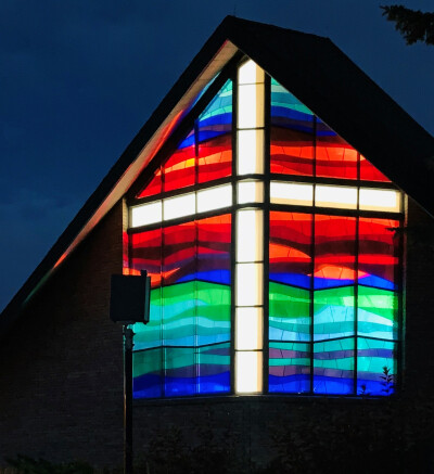 The beautiful Faith stained glass window is now lit up every evening until 11pm. We are shining our light OUT. Materials to make this possible were donated in memory of LaVonne Forsythe.